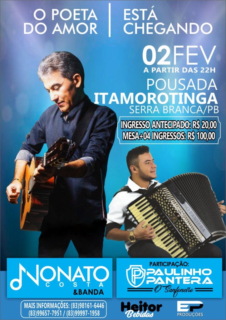 No dia 02 de Fevereiro, às 22h, na Pousada Itamorotinga, em Serra Branca, o cariri irá cantar e se emocionar junto com Nonato Costa, em um show de muito romantismo, além disso, a noite também será ao som do sanfoneiro Paulinho Pantera. Esse será o primeiro show de Nonato Costa em carreira solo, na região do cariri paraibano.