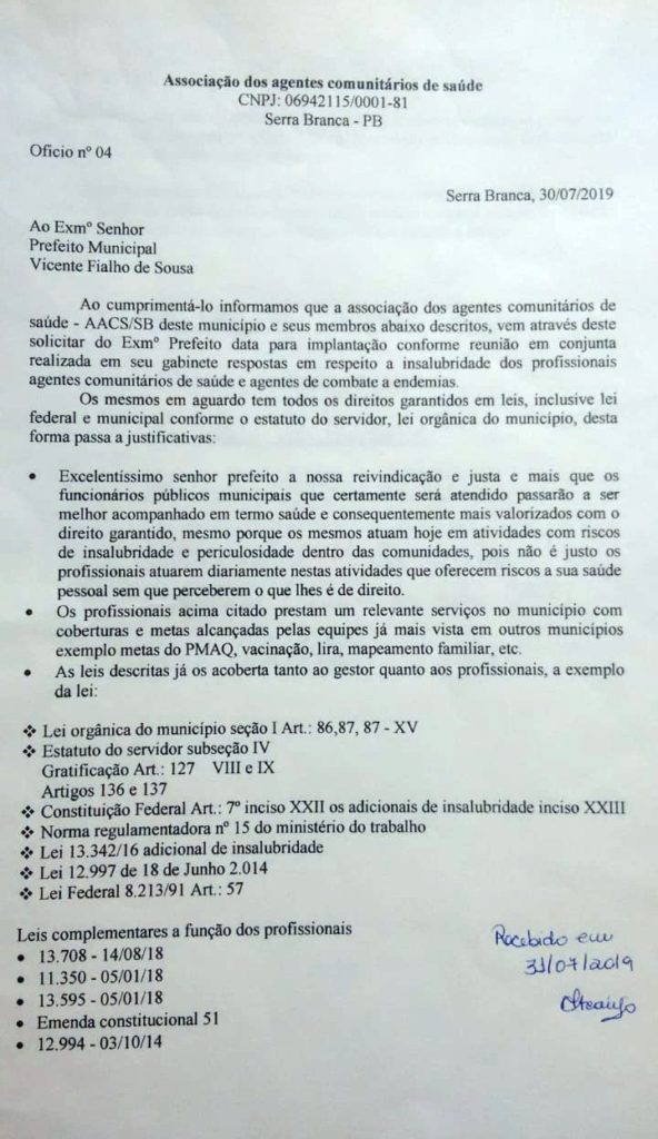 A Associação dos Agentes Comunitários de Saúde do Município de Serra Branca protocolou um ofício, na última quarta-feira(31/07), junto a Prefeitura Municipal, em que pede adicional de insalubridade para categoria e também para os Agentes de Combate a Endemias – ACE.