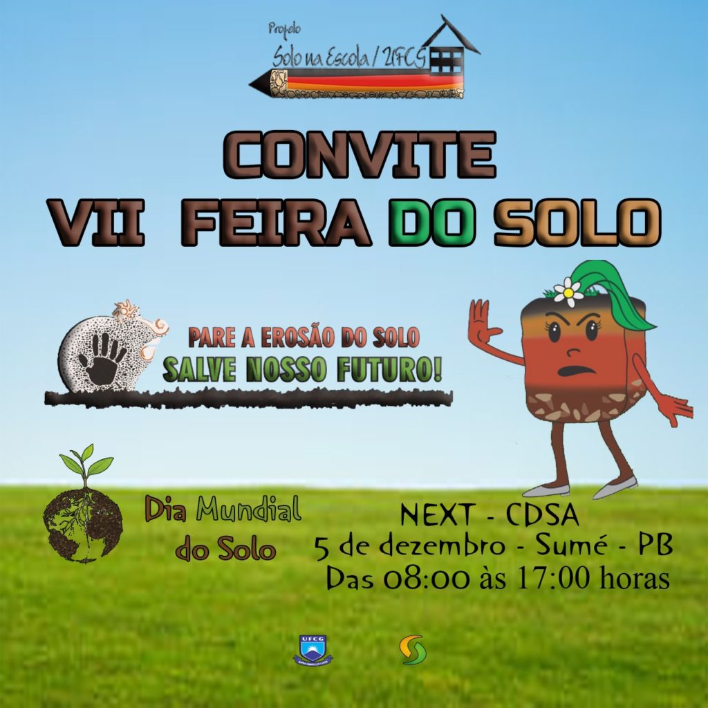 O Projeto Solo na Escola/UFCG, do Centro de Desenvolvimento Sustentável do Semiárido da Universidade Federal de Campina Grande realizará nesta quinta-feira, dia 5 de dezembro, a VII Feira do Solo, em alusão ao Dia Mundial do Solo. O tema do evento será “Pare a erosão do solo. Salve nosso futuro!”