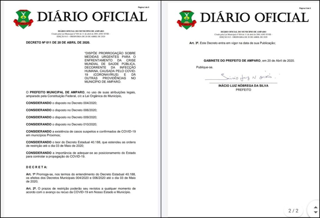 O Prefeito de Amparo, Inácio Nóbrega, confirmou a prorrogação de todos os decretos anteriores já publicados, através do decreto No 011, mantendo todas as determinações em relação ás medidas de prevenção contra o coronavírus.