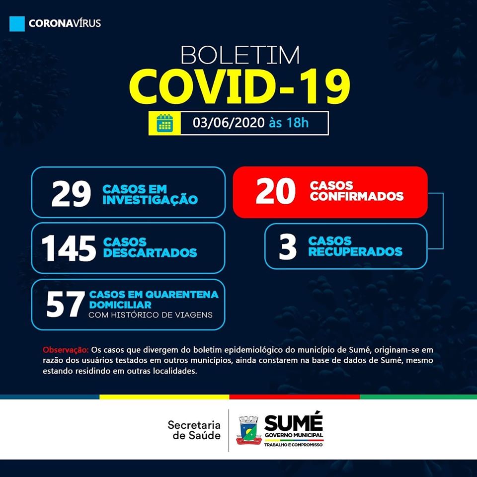 Sumé tem 20 casos confirmados, 3 recuperados, 29 casos em investigação, 145 casos descartados e 57 casos em quarentena domiciliar.