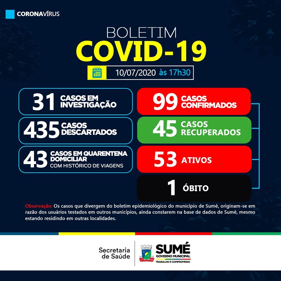 Assim, o município de Sumé tem 99 caso positivos, 45 recuperados e 01 óbito.