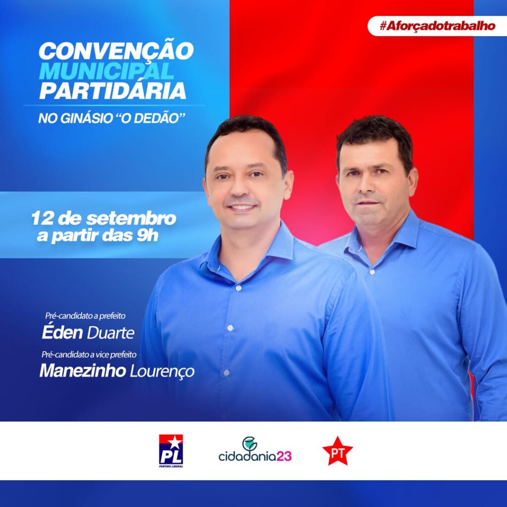 A convenção irá homologar a candidatura à reeleição de Éden Duarte (PL) para prefeito, além do nome do ex-vereador e agropecuarista, Manezinho Lourenço, como candidato à vice-prefeito.