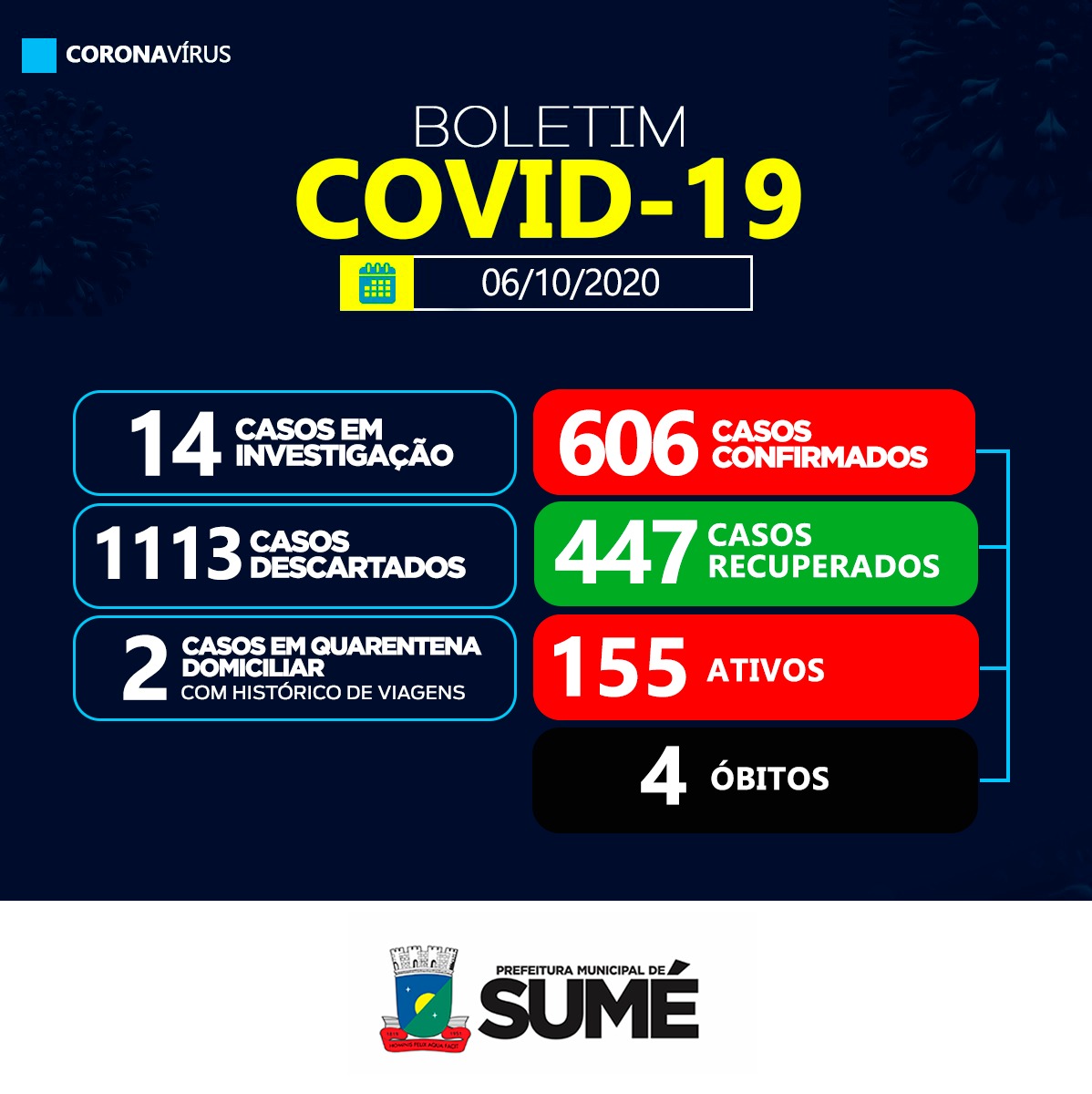 A Secretaria Municipal de Saúde de Sumé informa que foram registrados 19 casos positivos para o Coronavírus nesta terça-feira, 06.