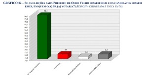 Se as eleições fossem hoje em Ouro Velho, no Cariri paraibano, Dr. Augusto Valadares (Democratas) seria eleito com 78,4%. A segunda colocada é Irmã Paula (PSD), que teria 8,8% dos votos. Branco, nulo ou nenhum somam 4,4%, enquanto indecisos ou que ainda não sabem representam 8,4% do eleitorado. É o que apontam os dados do cenário da pesquisa estimulada realizada no município pelo Instituto Opinião, em parceria com o Portal MaisPB, divulgada nesta segunda-feira (12).