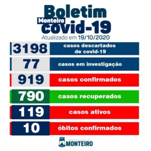 Secretaria Municipal de Saúde de Monteiro informou que na última segunda- feira (19/10), foram confirmados mais 20 novos casos para Covid-19, totalizando assim 919.