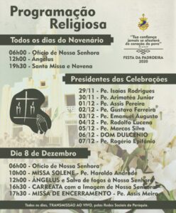 A edição de 2020 terá novo formato: não haverá a festa social nem a tradicional procissão do dia 08, entretanto, uma carreata marcará o dia festivo e a Missa de encerramento será campal, na frente da Igreja Matriz, obedecendo todas as normas de saúde.