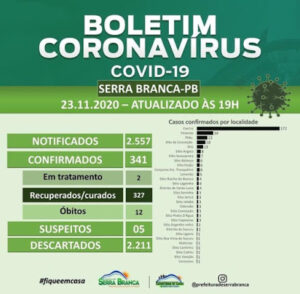A Prefeitura Municipal de Serra Branca, através da Secretaria de Saúde, emitiu mais um boletim do Covid-19. Nesta segunda-feira (23/11), 07 novos casos foram registrados, totalizando 341.
