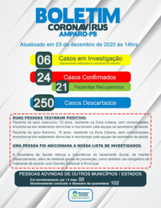 A Prefeitura Municipal de Amparo informa que nesta quinta-feira (03/12), foram confirmados 02 casos para Covid-19, totalizando assim 24.