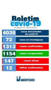Secretaria Municipal de Saúde de Monteiro informa que nesta Terça-feira, 08, mais 05 novos casos CONFIRMADOS para Covid-19.