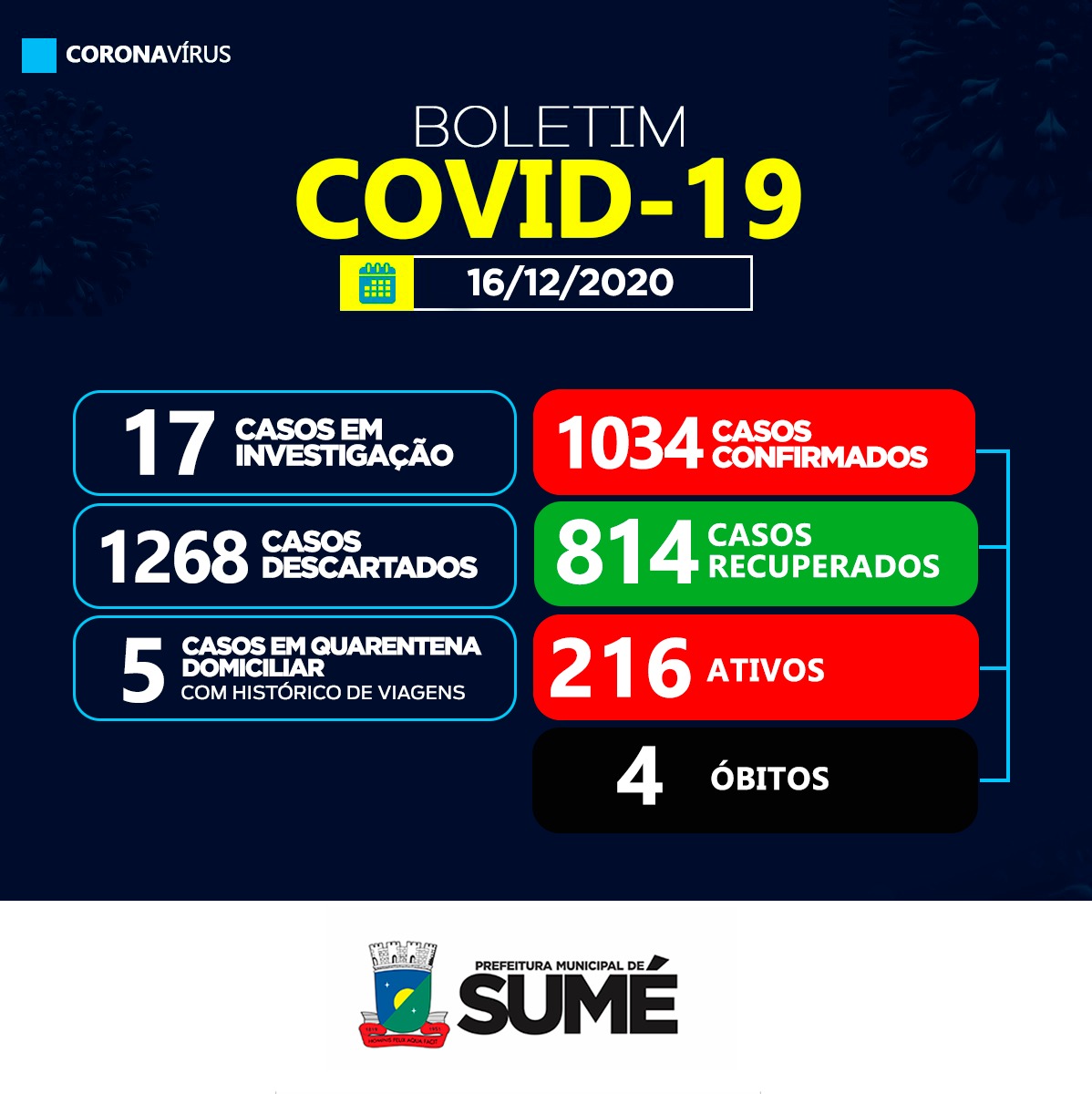 A Secretaria Municipal de Saúde de Sumé informa que foram registrados 32 casos positivos para o coronavírus nesta quarta-feira, 16.