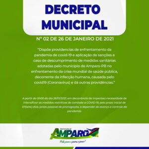 A Prefeitura de Amparo publicou um novo decreto nessa terça-feira (26), o qual dispõe providencias de enfrentamento da pandemia de Covid-19 e aplicação de sanções e caso de descumprimento de medidas sanitárias adotadas pelo município no enfrentamento da crise mundial de saúde pública, decorrente da infecção humana, causada pela pandemia. Esse decreto entra em vigor a partir das 00 horas desse dia 26 de janeiro válido por 07 dias, prazo passível de prorrogação, a depender do avanço e controle da pandemia.