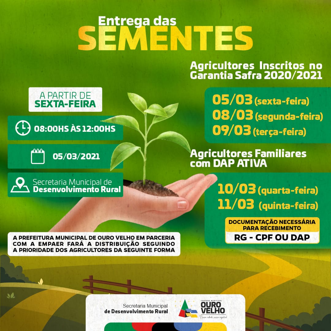 A secretaria de agricultura de Ouro Velho, começará nesta quarta-feira (10) a entrega de sementes aos agricultores com DAP ATIVA. A retirada das sementes está sendo realizada na sede da secretaria de agricultura do município.