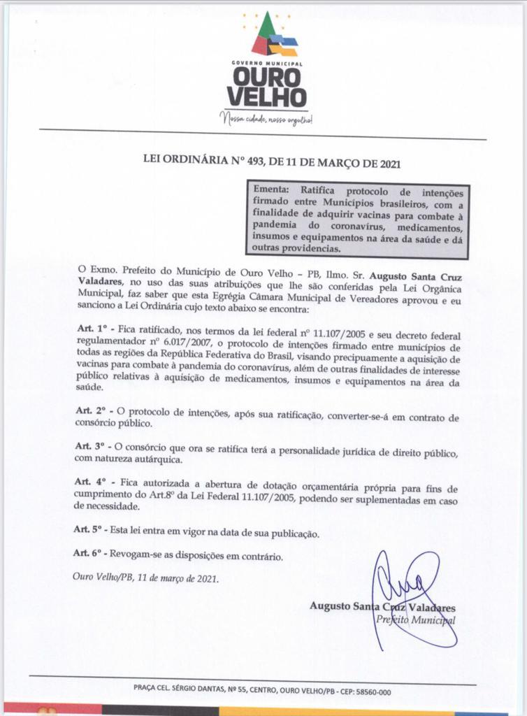 O prefeito de Ouro Velho, Dr Augusto Valadares (DEM) sancionou o projeto de lei (PL) Nº.493/2021 necessário para o ingresso do município no Consórcio Nacional para compra de vacinas contra a Covid-19.
