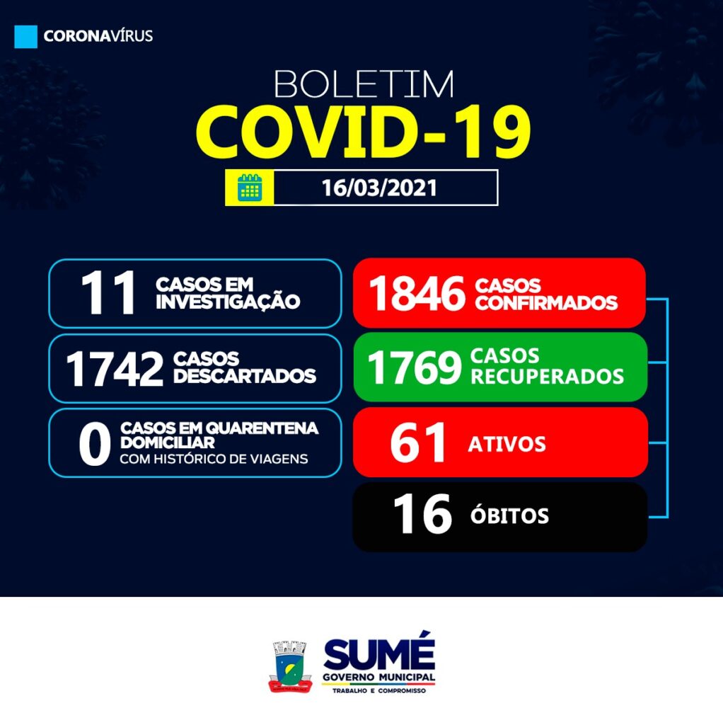 A Secretaria Municipal de Saúde de Sumé registrou nesta terça-feira (16), mais 05 casos positivos para o coronavírus.