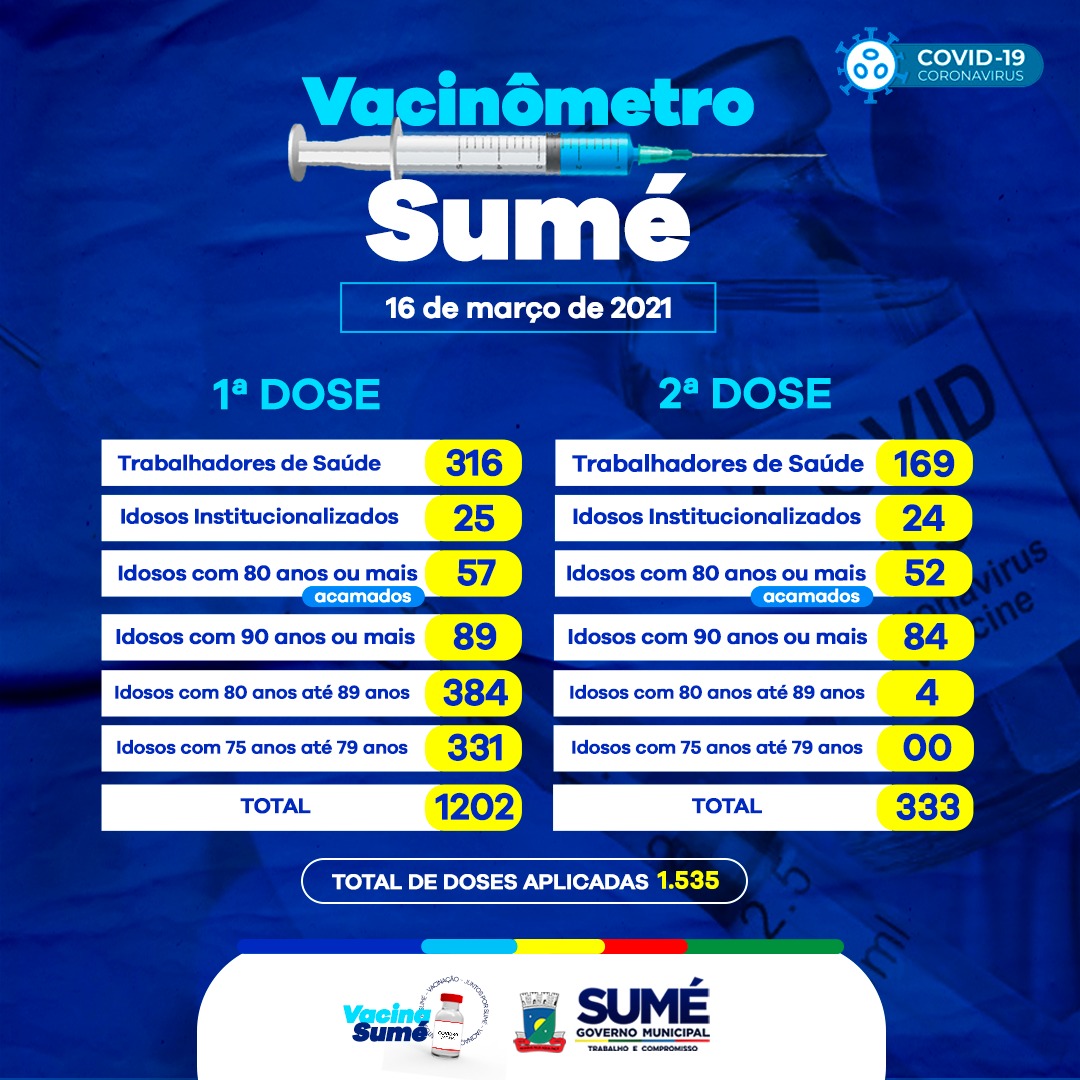 A Secretaria de Saúde atualiza os números das doses aplicadas da vacina contra o coronavírus no município.