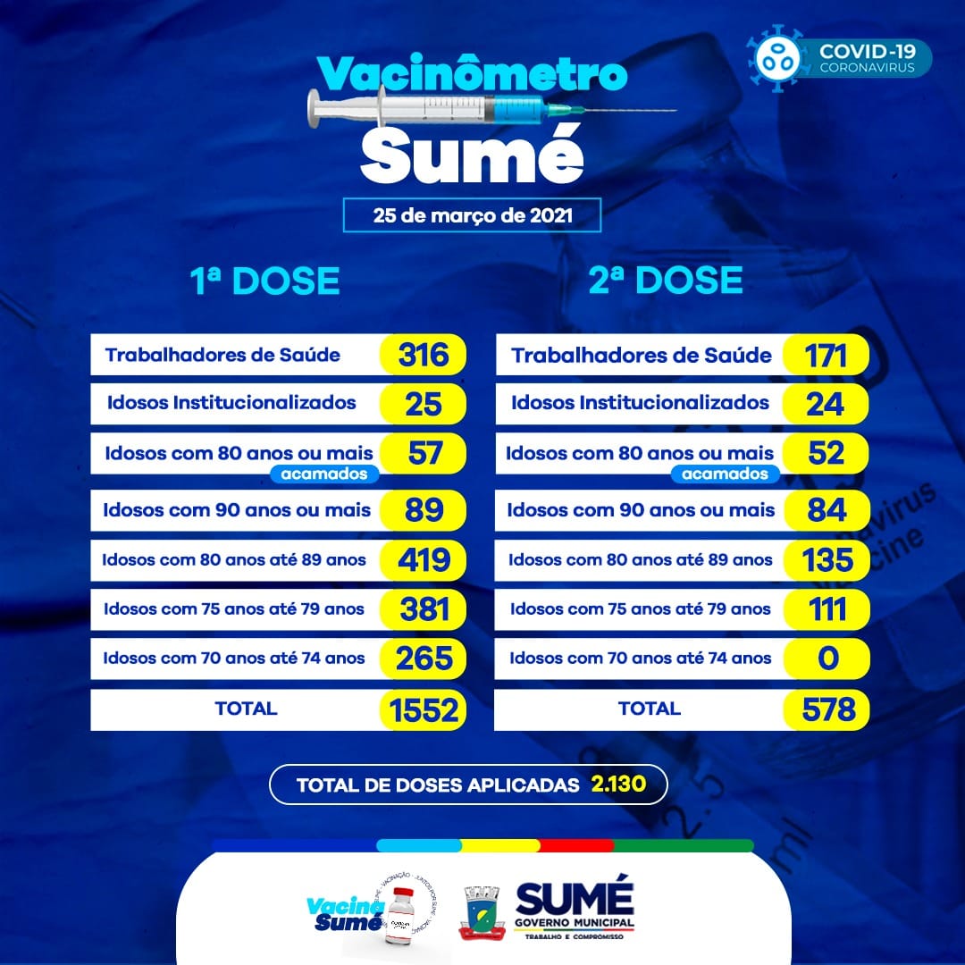 A Secretaria de Saúde atualiza os números das doses aplicadas da vacina contra o coronavírus no município.