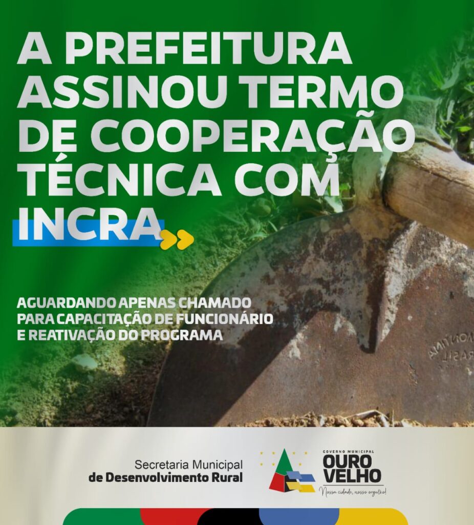 Com o objetivo de fomentar as políticas voltadas para a melhoria de vida dos produtores rurais, a Prefeitura Municipal de Ouro Velho, através da Secretaria de Desenvolvimento Rural firmou nesta terça-feira (30), uma parceria com o Incra, através da assinatura de um Termo de Cooperação Técnica.