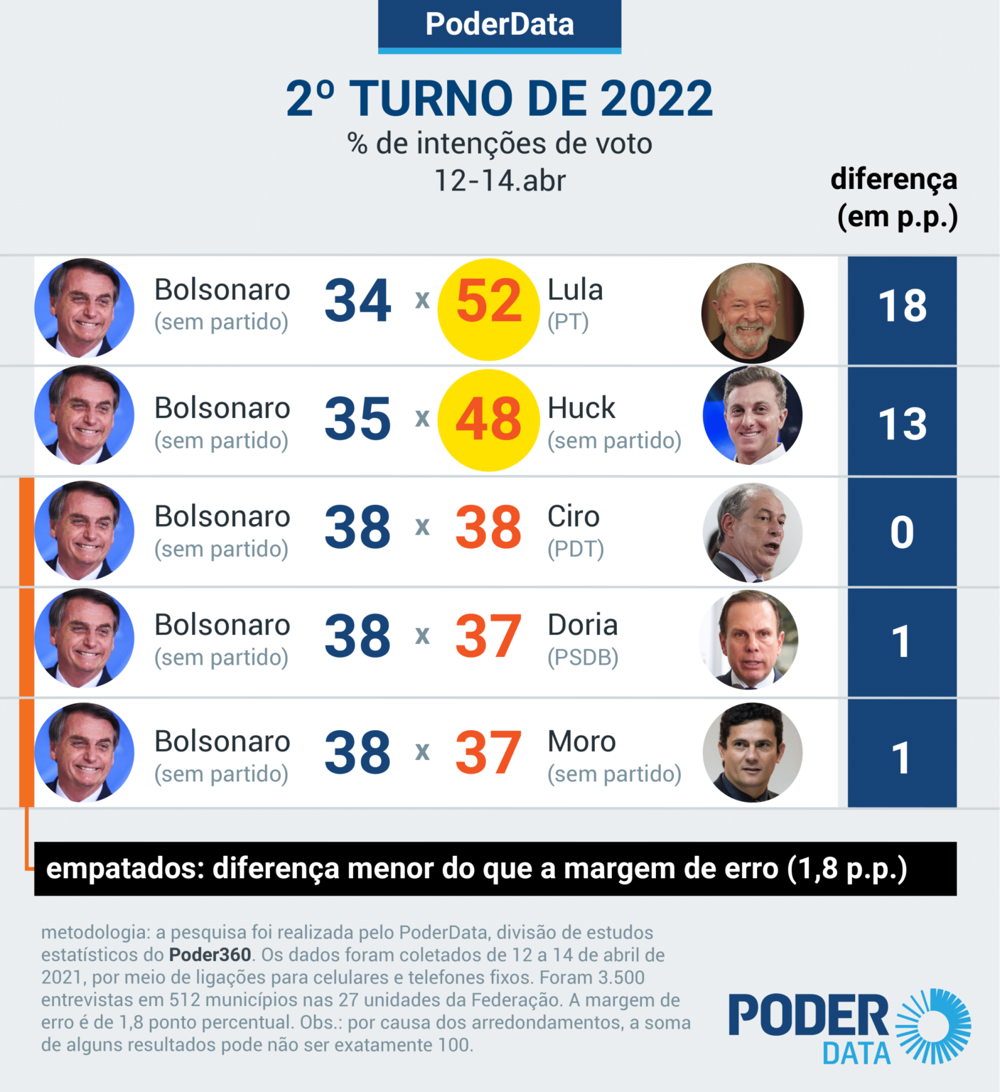 Pesquisa PoderData, realizada em todo o Brasil com 3.500 entrevistas nesta semana (12-14.abr.2021), indica que Luiz Inácio Lula da Silva (PT) teria 18 pontos de vantagem sobre Jair Bolsonaro (sem partido) num eventual 2º turno na disputa pelo Palácio do Planalto. O petista teria 52% contra 34% do atual presidente.