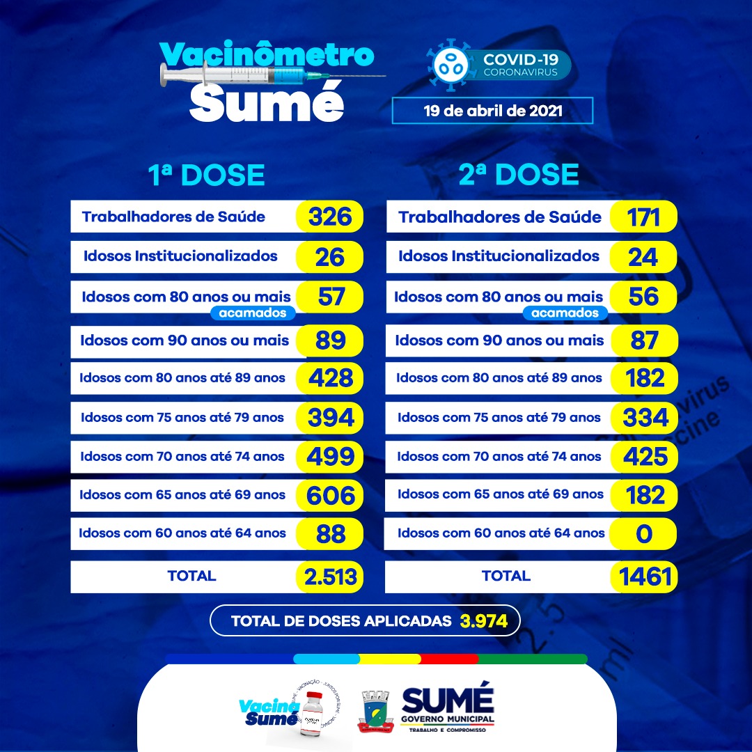 A Secretaria de Saúde atualiza os números das doses aplicadas da vacina contra o coronavírus no município.