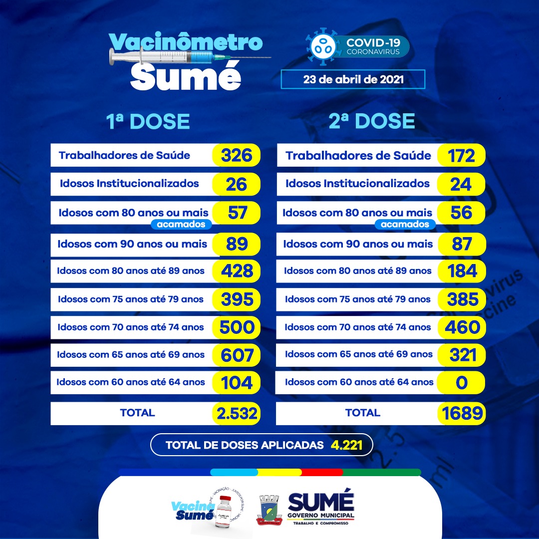 A Secretaria de Saúde atualiza os números das doses aplicadas da vacina contra o coronavírus no município.