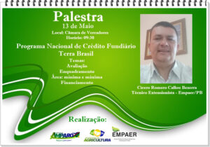 A Secretaria de Agricultura de Amparo promoverá na próxima quinta-feira (13), em parceria com a EMPAER-PB uma palestra sobre Crédito Fundiário do Programa Terra Brasil, com o Técnico Extensionista Cícero Romero Callou Bezerra.