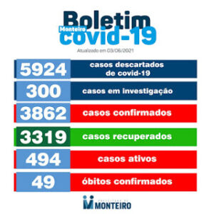 A Secretaria Municipal de Saúde de Monteiro informa que nesta Quinta feira, 03, tivemos mais 102 novos casos, CONFIRMADOS para COVID-19.