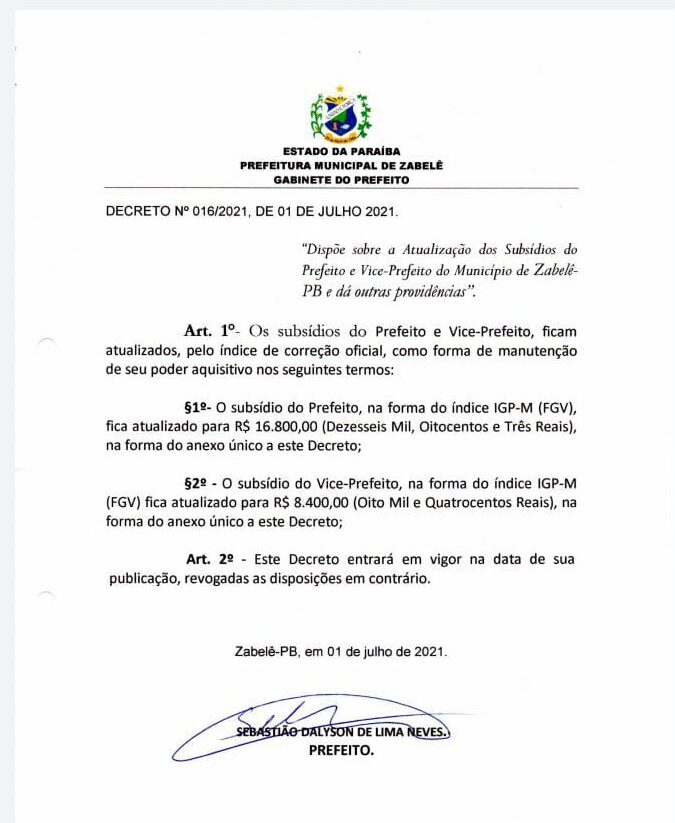 Localizado no Cariri paraibano, Zabelê é um dos menores municípios da Paraíba e se mantém praticamente com recursos do FPM. Mas, o prefeito da cidade, Dalyson Neves (PSDB), mesmo diante da pandemia do Covid-19, e emitiu um decreto aumentando o seu próprio salário e o da vice-prefeita do município. A atualização salarial ocorreu por meio do decreto n° 016/2021, de 1º julho deste ano.