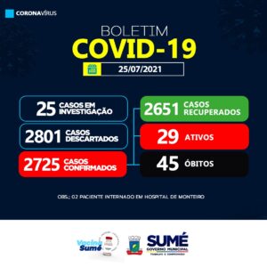 A Secretaria de Saúde de Sumé não registra nenhum caso de coronavírus para este domingo, (25/07).