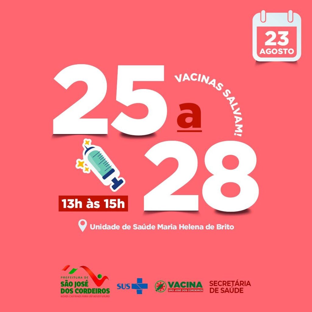 Nesta segunda-feira (23), é a vez de quem tem entre 25 e 28 anos. A vacinação ocorre das 13 às 15h na Unidade de Saúde Maria Helena de Brito.