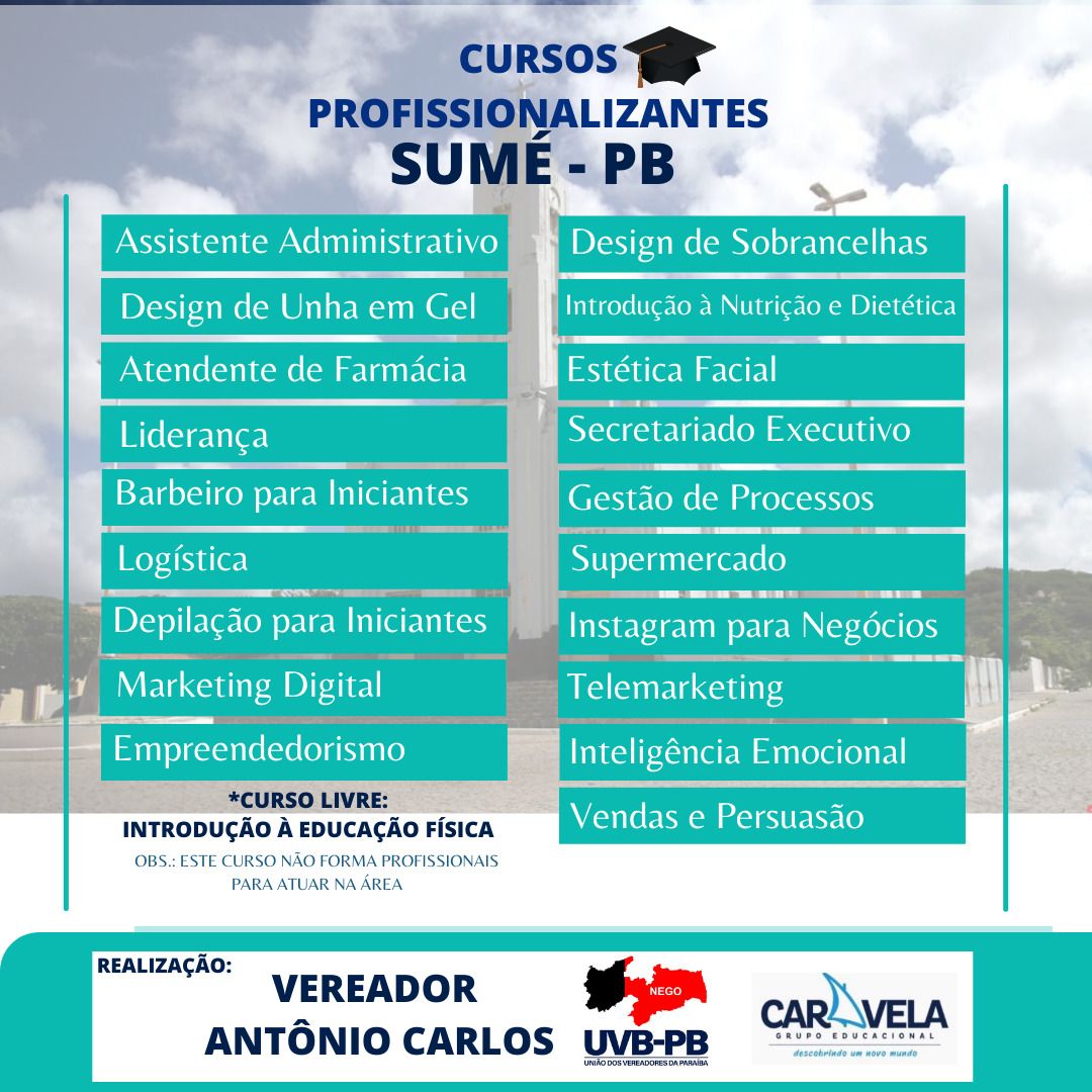 Em uma parceria firmada pelo vereador Antônio Carlos Sarmento, as pessoas interessadas em participar dos cursos descritos, pagarão apenas uma taxa de (38,90),e poderão fazer sua(s) inscrição(s), nos cursos. No término de cada curso receberão seus certificados.