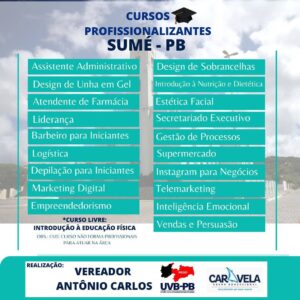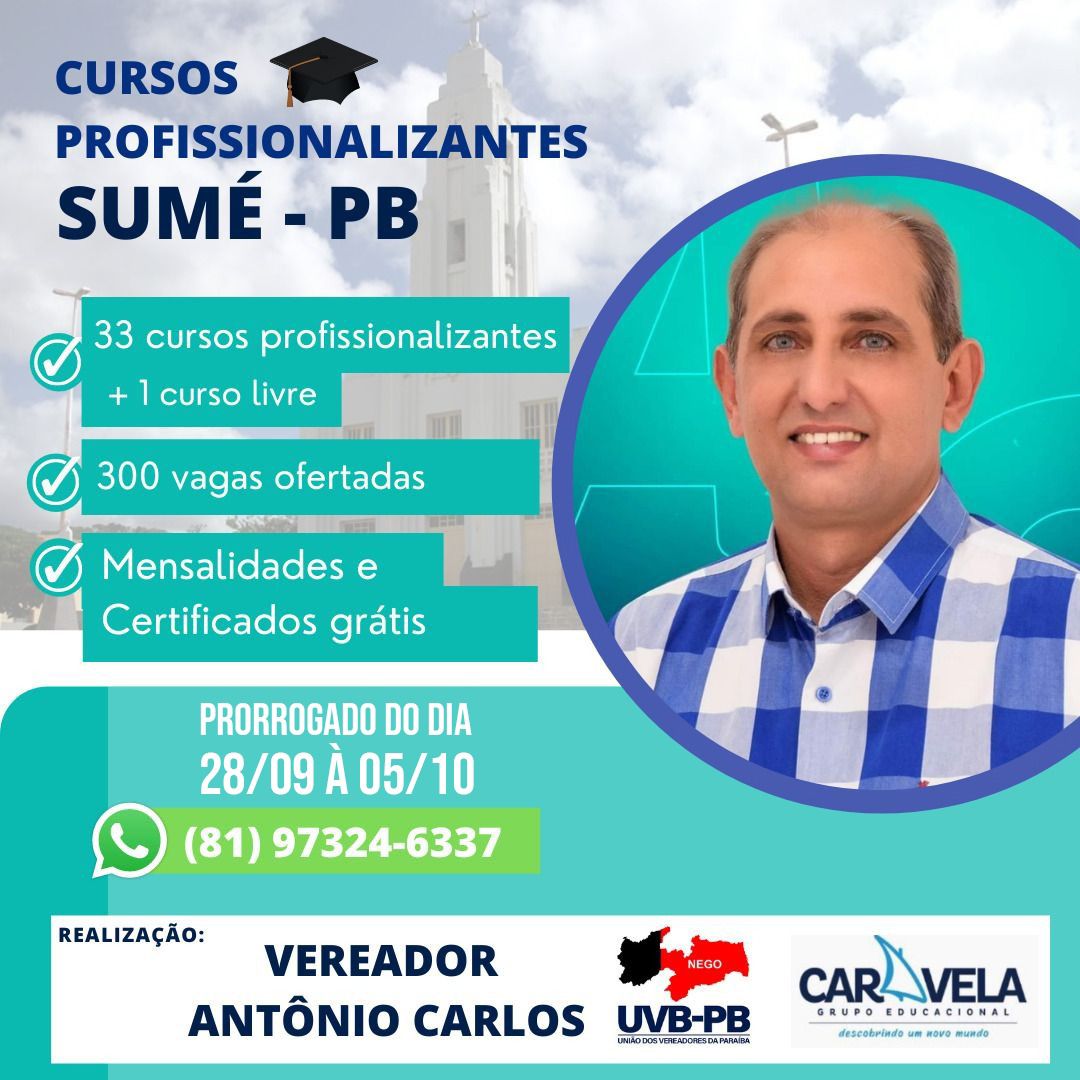 As inscrições para os cursos profissionalizantes ofertados através da parceria do presidente da Câmara de Vereadores de Sumé, Antônio Carlos Sarmento, com o Grupo Caravela Educacional, foram prorrogadas até o dia 05 de outubro.