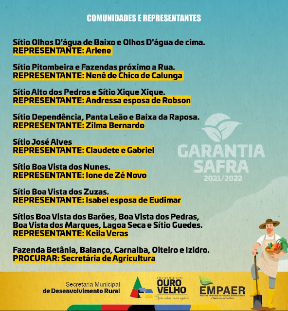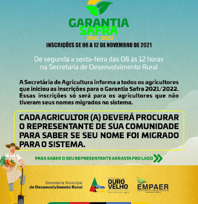 A Prefeitura de Ouro Velho, através da Secretaria de Desenvolvimento Rural informa que a realização da inscrição para o garantia Safra 2021 será de 08 a 12 de novembro(segunda a sexta-feira).