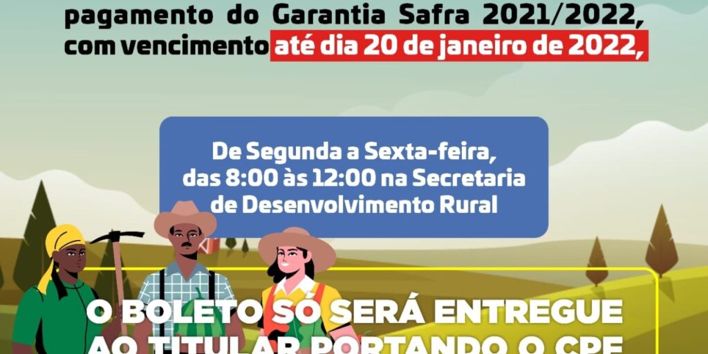 A Prefeitura de Ouro Velho comunica aos agricultores, inscritos no Programa Garantia-Safra, que os boletos já estão disponíveis na Secretaria do Desenvolvimento Rural, até o dia 20 de janeiro de 2022, com expediente de segunda a sexta das 8h às 12h.