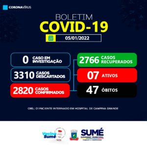 A Secretaria de Saúde de Sumé registrou 01 novo caso de coronavírus para esta quarta-feira, (05/01).