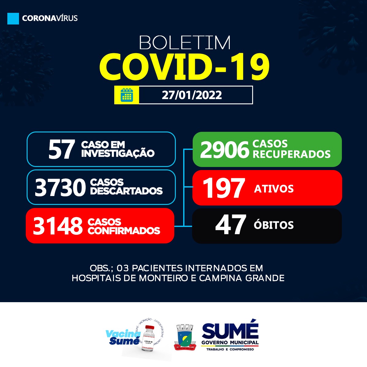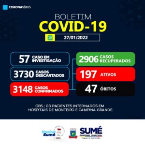 A Secretaria de Saúde de Sumé registrou 12 novos casos de coronavírus para esta quinta-feira, (27/01).