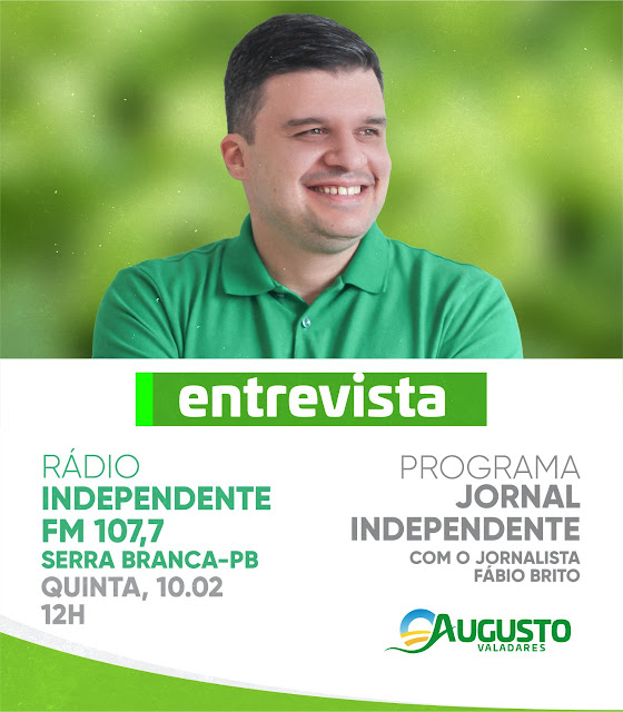 O prefeito de Ouro Velho Drº Augusto Valadares será o entrevistado desta quinta-feira (10), do JORNAL INDEPENDENTE comandado pelo experiente jornalista Fábio Brito, na rádio INDEPENDENTE FM de Serra Branca, uma das emissoras de maior alcance de todo o Cariri e de todo o interior da Paraíba.