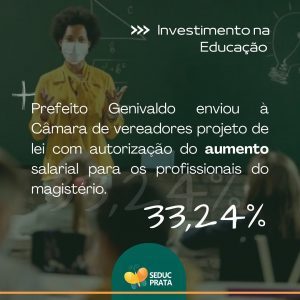 O prefeito Genivaldo Fernandes enviou à Câmara de Vereadores de Prata, o projeto de lei com autorização de aumento salarial de 33,24% para profissionais do magistério.
