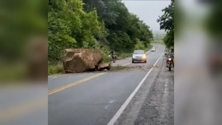Uma rocha se desprendeu do barranco e caiu às margens da PB-105, entre as cidades de Bananeiras e Belém, na manhã desta segunda-feira (4), no brejo paraibano.