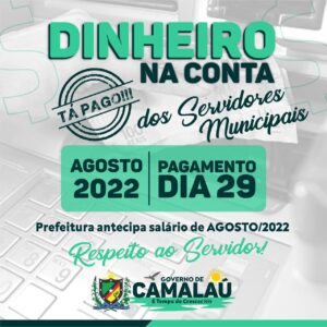 A Prefeitura de Camalaú anunciou nesta segunda-feira (29) a antecipação do pagamento dos servidores referente ao mês de agosto.