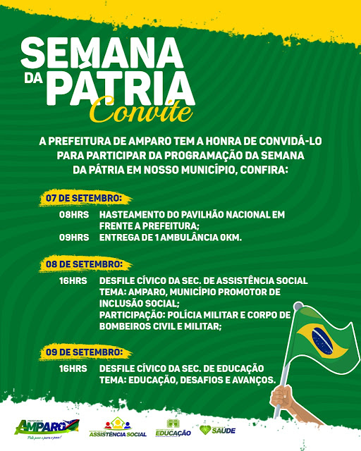 A Prefeitura de Amparo estará promovendo em parceria com as Secretarias Municipais de Educação, Assistência Social e Saúde, uma grande programação na semana da pátria, com desfiles e uma surpresa para a população, a prefeitura estará entregando uma ambulância 0KM.