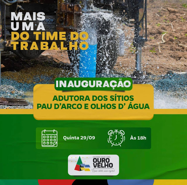 A Prefeitura de Ouro Velho entrega nesta quinta-feira (29), as adutoras do sítio Pau D’arco e Olhos d’água, na zona rural do município. A água encanada realiza o sonho de várias famílias das duas comunidades.