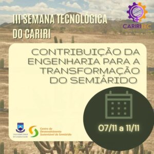 O projeto Cariritec do Centro de Desenvolvimento Sustentável do Semiárido da UFCG realizará no período de 7 a 11 de novembro, a III Semana Tecnológica do Cariri, evento que contará com a participação de professores e profissionais que irão ministrar palestras, minicursos e mesas redondas nas mais diversas áreas das engenharias e exatas, promovendo muito conhecimento e aplicações práticas.