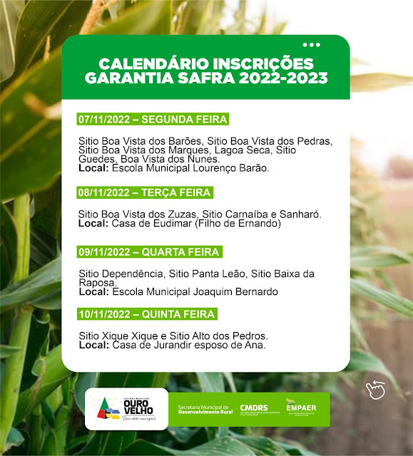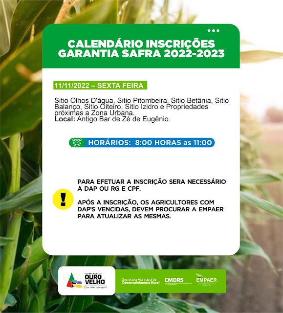 A prefeitura de Ouro Velho por meio da Secretaria de Desenvolvimento Social, divulgou o calendário de inscrições do Garantia Safra 2022/2023.