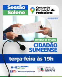A Câmara de Vereadores de Sumé irá realizar nesta terça-feira (06), uma sessão solene para entrega de títulos de cidadão sumeense.