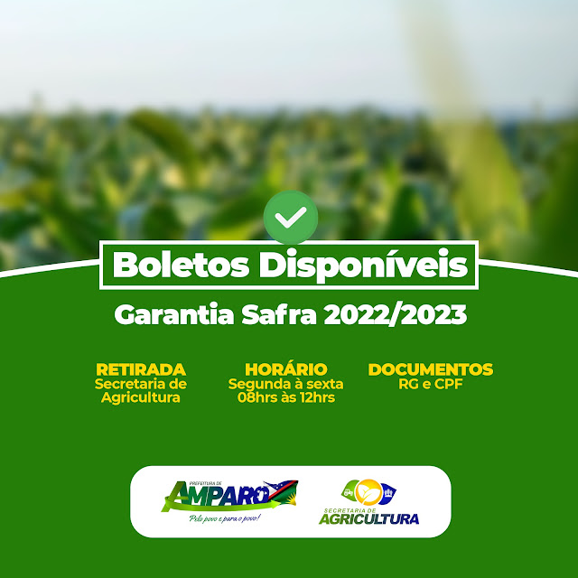 A Prefeitura de Amparo, por meio da Secretaria de Agricultura do município, comunica aos agricultores beneficiados com o Programa Garantia Safra 2022/2023 que a partir dessa segunda-feira (16), os boletos para pagamento da parcela já estão disponíveis.