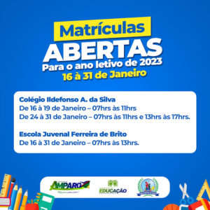 A Secretaria de Educação de Amparo já está realizando as matrículas para os alunos do Ensino Fundamental e da Educação Infantil o ano letivo de 2023. As matrículas tiveram início nessa segunda-feira (16) e se estendem até o dia 31 de janeiro.