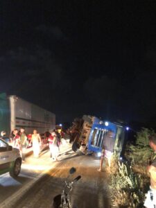 A ação brusca do veículo aconteceu no momento em que um caminhão carregado de frutas que trafegava pela rodovia. O motorista do caminhão para não colidir frontalmente com o carro, foi obrigado a jogar o veículo para o acostamento, vindo a capotar.
