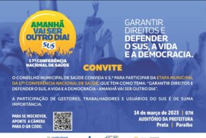 Com o tema “Garantir Direitos e Defender o SUS, a Vida e a Democracia – Amanhã vai ser outro dia”, a etapa municipal da 17ª Conferência Nacional de Saúde será realizada no dia 14 de Março de 2023, no município da Prata.