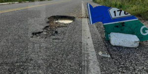 Se não bastassem os pequenos buracos, agora estão sendo formadas várias “crateras” (buracos profundos) que estão aparecendo em toda a extensão da rodovia, deixando a população preocupada com possíveis acidentes e prejuízos financeiros com a quebra de peças de automóveis.